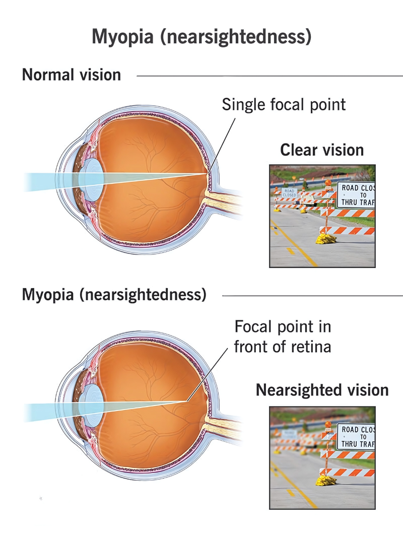 The structure of your eye is to blame. When your eyeball is too long or the cornea -- the protective outer layer of your eye -- is too curved, the light that enters your eye won’t focus correctly. Images focus in front of the retina, the light-sensitive part of your eye, instead of directly on the retina. This causes blurred vision. Doctors call this a refractive error.
